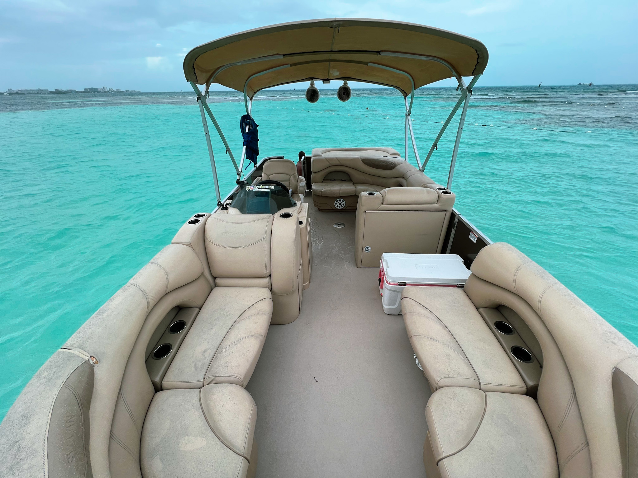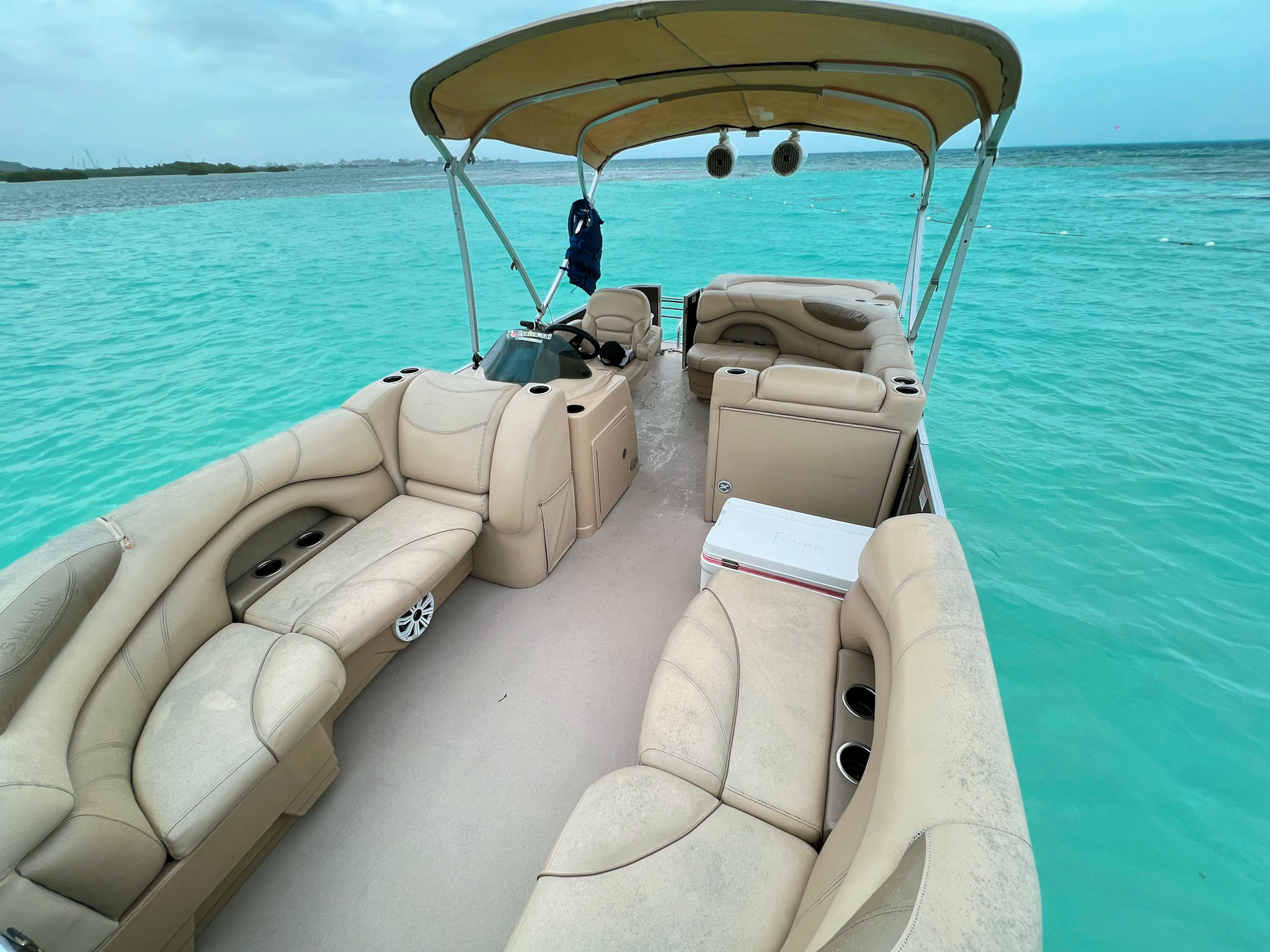 Embarcacion tipo ponton "planchon" con lujosos muebles e instalaciones, en la cual podrás disfrutar de una mañana, tarde o dia completo en la bahía, también podrás llevar tus bebidas preferidas. En él encontrarás una cómoda nevera donde podrás mantener tus bebidas frías. Cuenta con sonido, pero si prefieres podrás conectarte via bluetoooth y disfrutar de tu play list favorita.