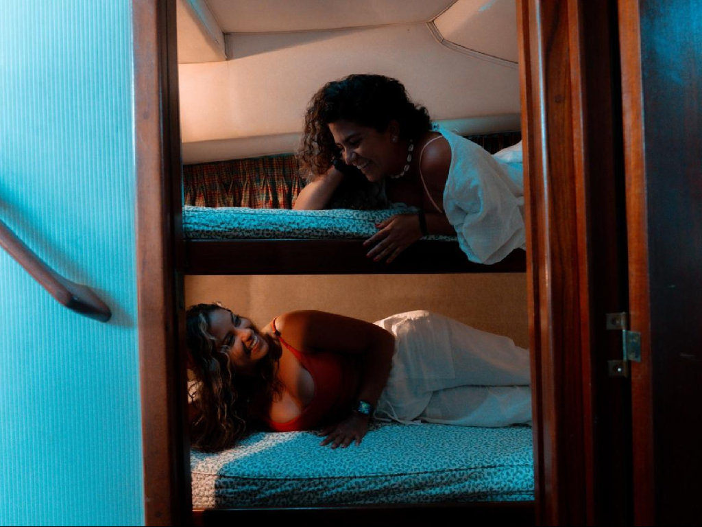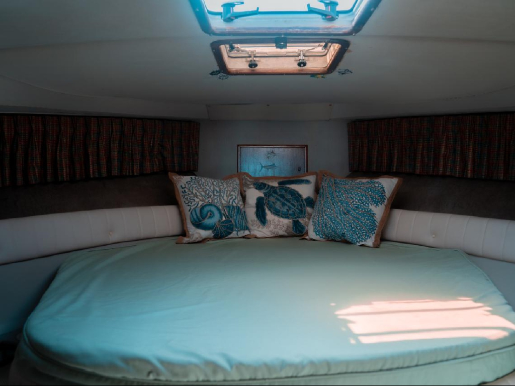 Cuenta con dos camarotes, una sala de estar, una cocina pequeña, un baño y aire acondicionado.