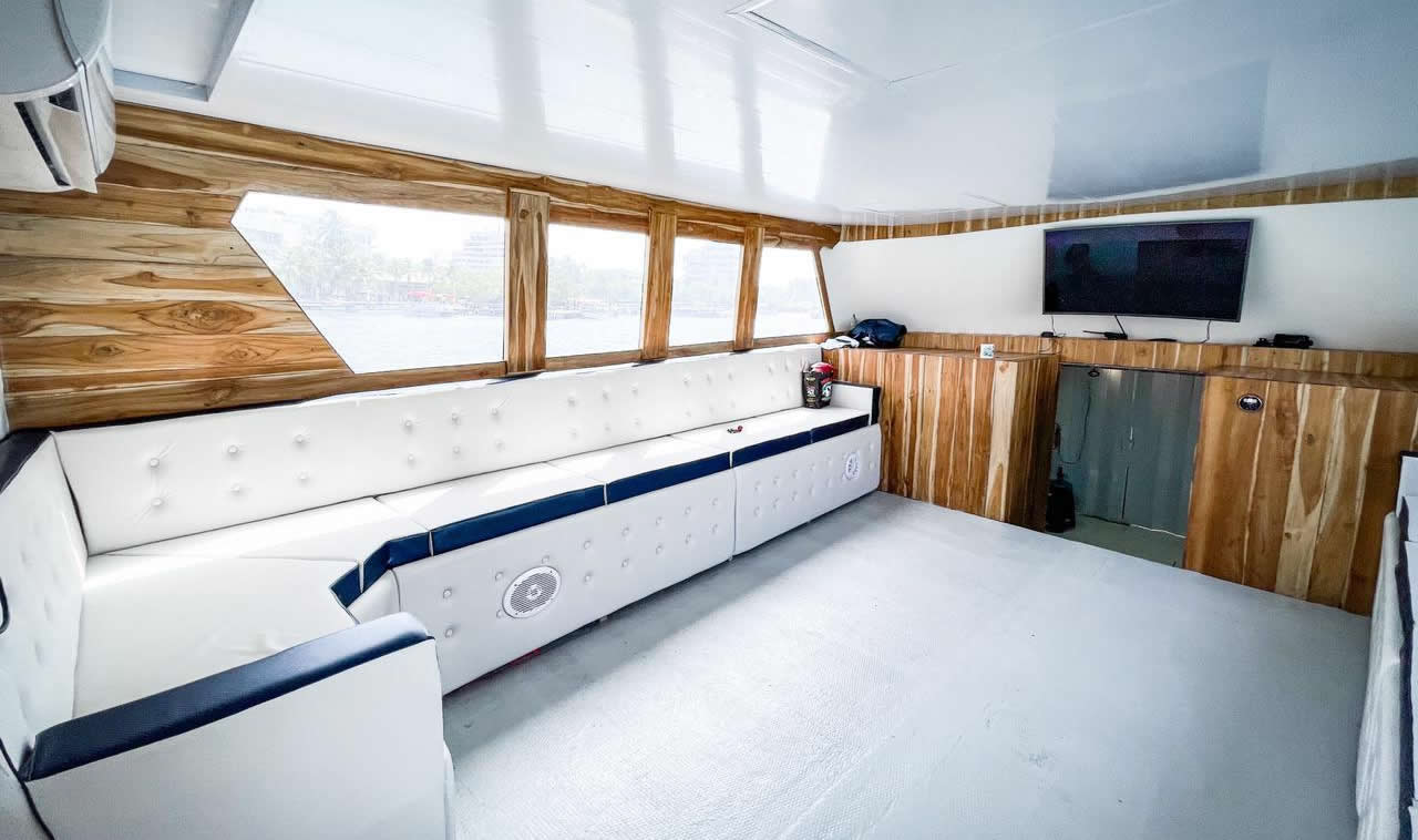Sleek sports yacht with comfortable seating and excellent facilities, where you can enjoy a morning, afternoon, or full day in the bay, and you can also bring your favorite beverages. Inside, you'll find a convenient refrigerator to keep your drinks cold. It features a sound system, but if you prefer, you can connect via Bluetooth and enjoy your favorite playlist. Make your trip an amazing experience.