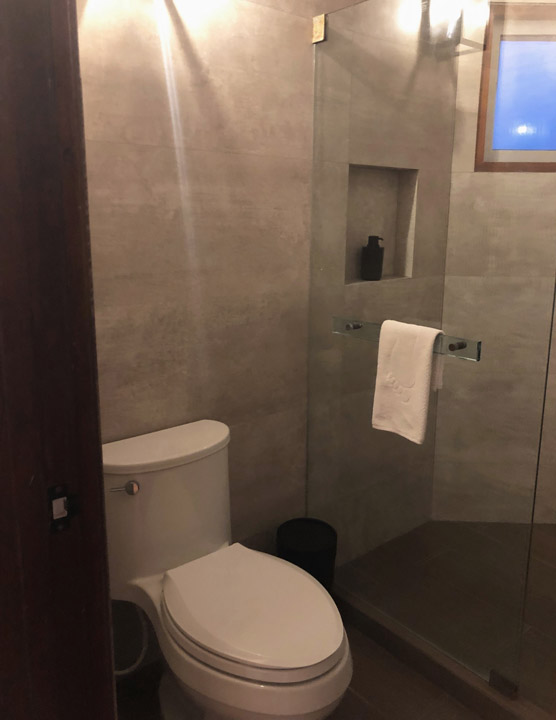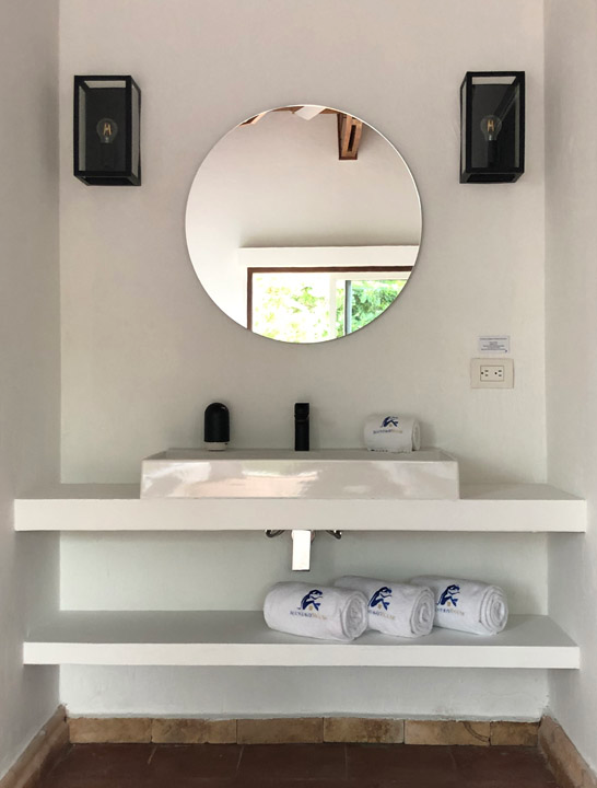 Baño completo con dos lavamanos, ducha al aire libre y tocador