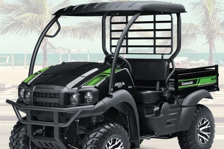 Este es el carrito Mula Kawasaki SX, ideal para parejas o familias de 2 personas y un infante. En este vehiculo podrás recorrer la isla por ti mismo/a, visitar los principales sitios de interes y atractivos turisticos naturales del destino, recibiendo la brisa del mar a donde sea que vayas.